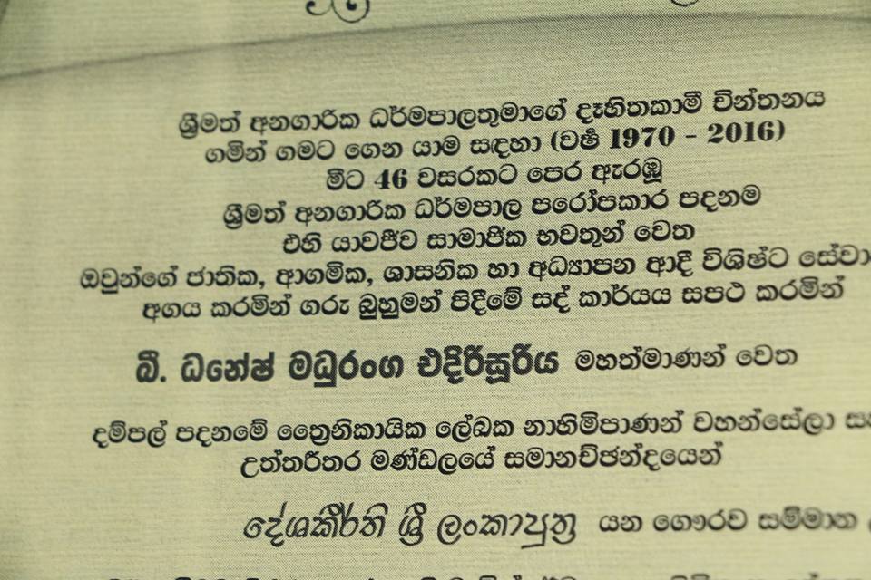 ශ්රීමත් අනගාරික ධර්මපාලතුමාගේ දෑහිතකාමී චින්තනය ගමින් ගමට ගෙනයාම සඳහා (වර්ෂ 1970-2016) මීට 46 වසරකට පෙර ඇරඹූ ශ්රීමත් අනගාරික ධර්මපාල පරෝපාකාර පදනම එහි යාවජීව සාමාජික භවතුන් වෙත ඔවුන්ගේ ජාතික, ආගමික, ශාසනික හා අධ්යාපන ආදී විශිෂ්ට සේවාවන් අගය කරමින් ගරු බුහුමන් පිදීමේ සද් කාර්යය සපථ කරමින්,