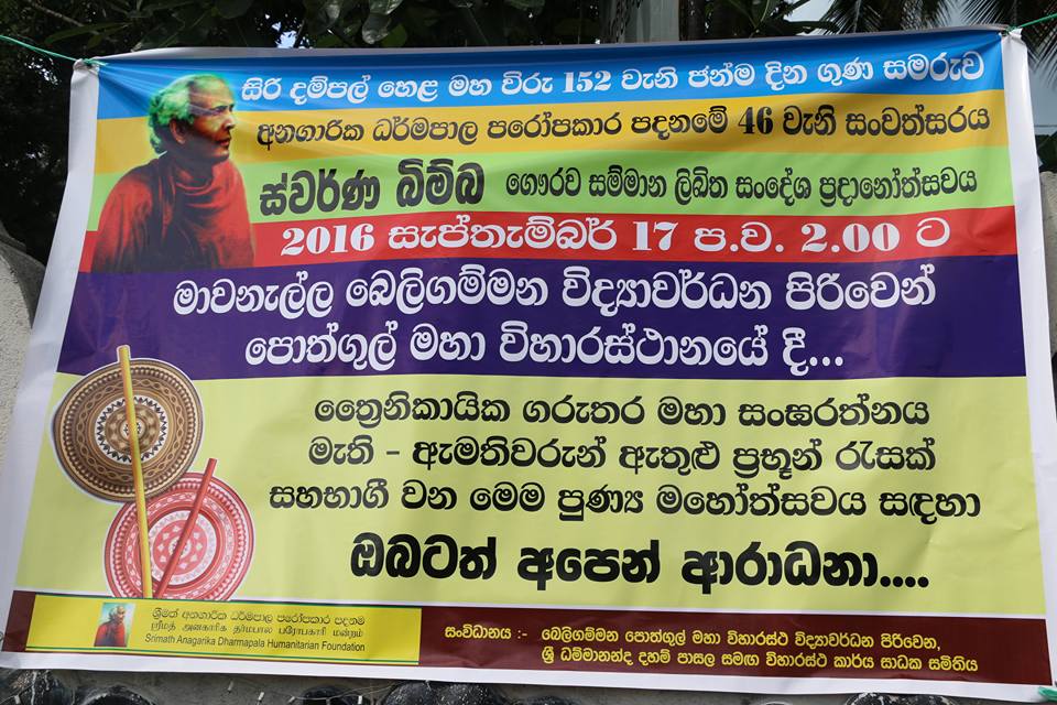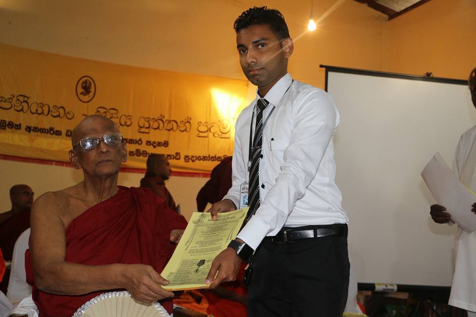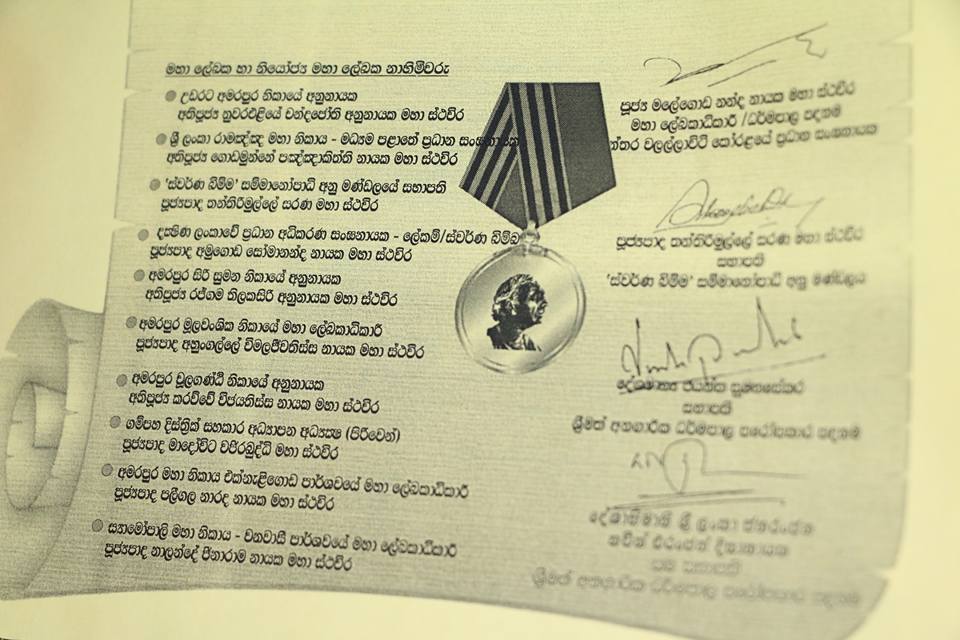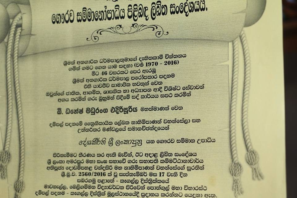 පිරිනැමීමට තීරණය කර ඇති බැවින්, ඊට අදාල ලිඛිත සංදේශය ශ්රී ලංකා අමරපුර මහා සංඝ සභාවේ ගරු සභාපති කම්මට්ඨානාචාර්ය අතිපූජ්ය දොඩම්පහළ චන්ද්රසිරි මහා නාහිමිපාණන් වහන්සේගේ සුරතින් ශ්රී බු.ව. 2560/2016ක් වූ සැප්තැම්බර් මස 17 වැනි දින සබරගමු පළාතේ – කෑගල්ල දිස්ත්රික්කයේ මාවනැල්ල, බෙලිගම්මන විද්යාවර්ධන පිරිවෙන් පොත්ගුල් විහාරස්ථ දම්පල් පදනම – කෑගල්ල දිස්ත්රික් මූලස්ථානයේදී ප්රදානය කරන්නට යෙදුනා.