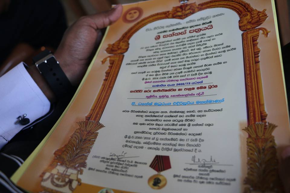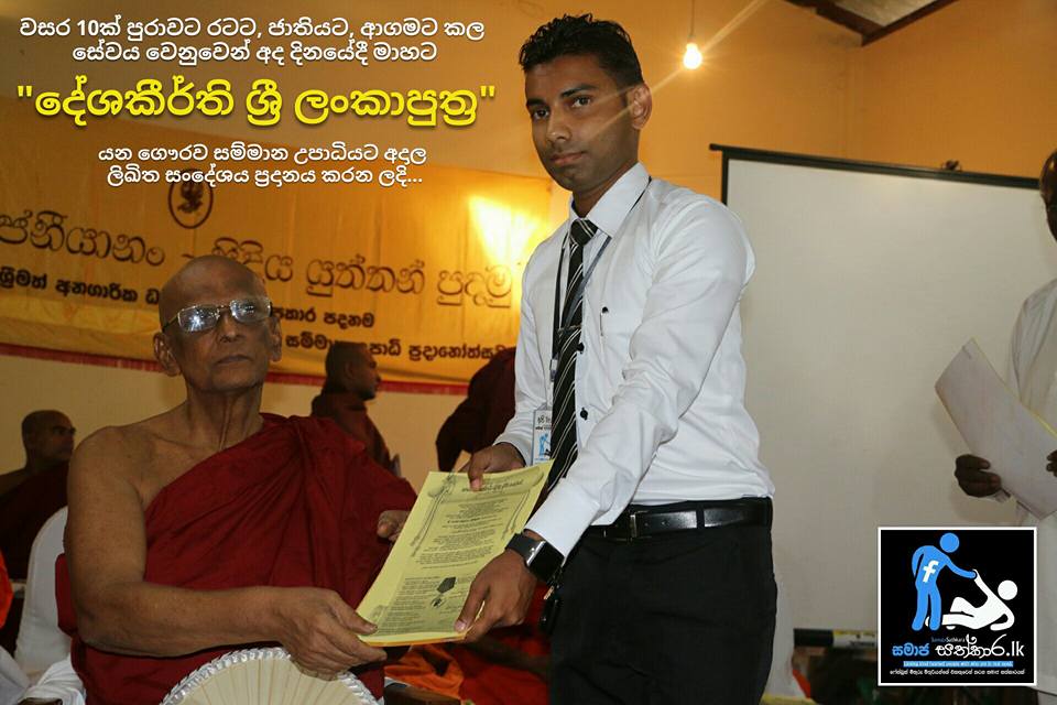 වසර 10ක් පුරාවට රටට, ජාතියට, ආගමට කල සේවය වෙනුවෙන් අද දිනයේදී මා හට “දේශකීර්ති ශ්රී ලංකාපුත්ර” යන ගෞරව සම්මාන උපාධියට අදාල ලිඛිත සංදේශය ප්රදානය කරන ලදි…
