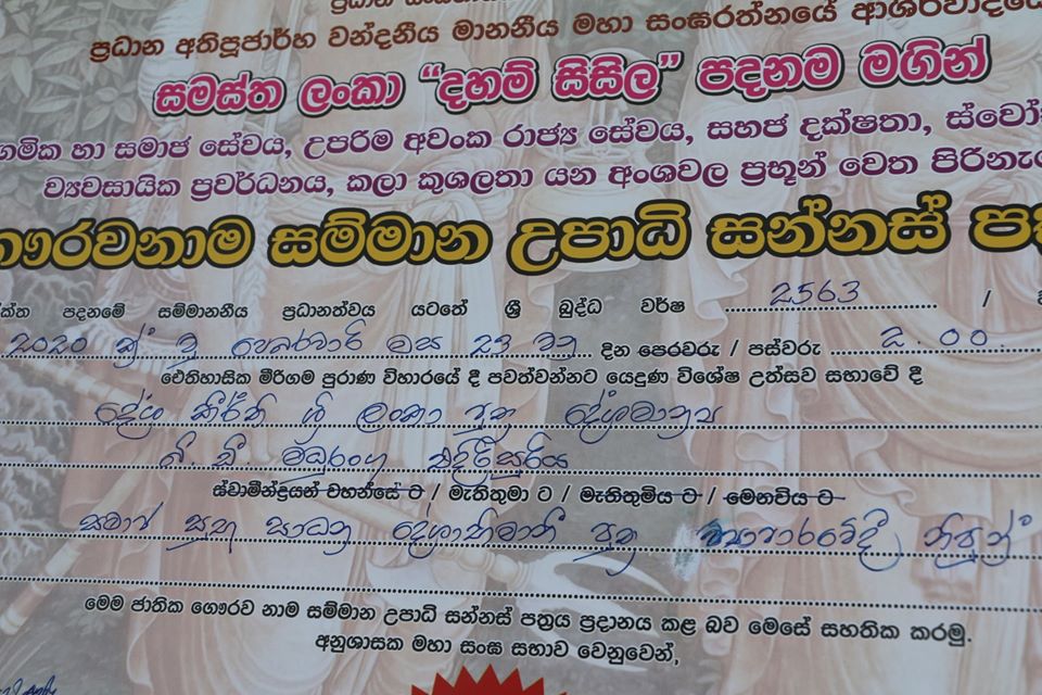 “සමාජ සුභ සාධන දේශාභිමානී පුත්ර ව්යාපාරවේදී නිපුන්” ජාතික ගෞරව නාම සම්මාන උපාධිය පිරිනමන ලදි.