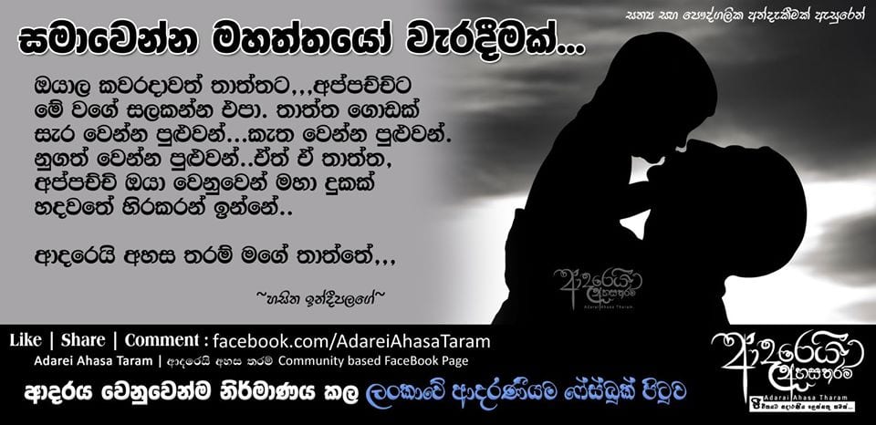 ඔයාල කවරදාවත් තාත්තට,,,අප්පච්චිට මේ වගේ සලකන්න එපා. තාත්ත ගොඩක් සැර වෙන්න පුළුවන්…කැත වෙන්න පුළුවන්…නුගත් වෙන්න පුළුවන්..එත් ඒ තාත්ත ,,අප්පච්චි ඔය වෙනුවෙන් මහා දුකක් හදවතේ හිරකරන් ඉන්නේ..
